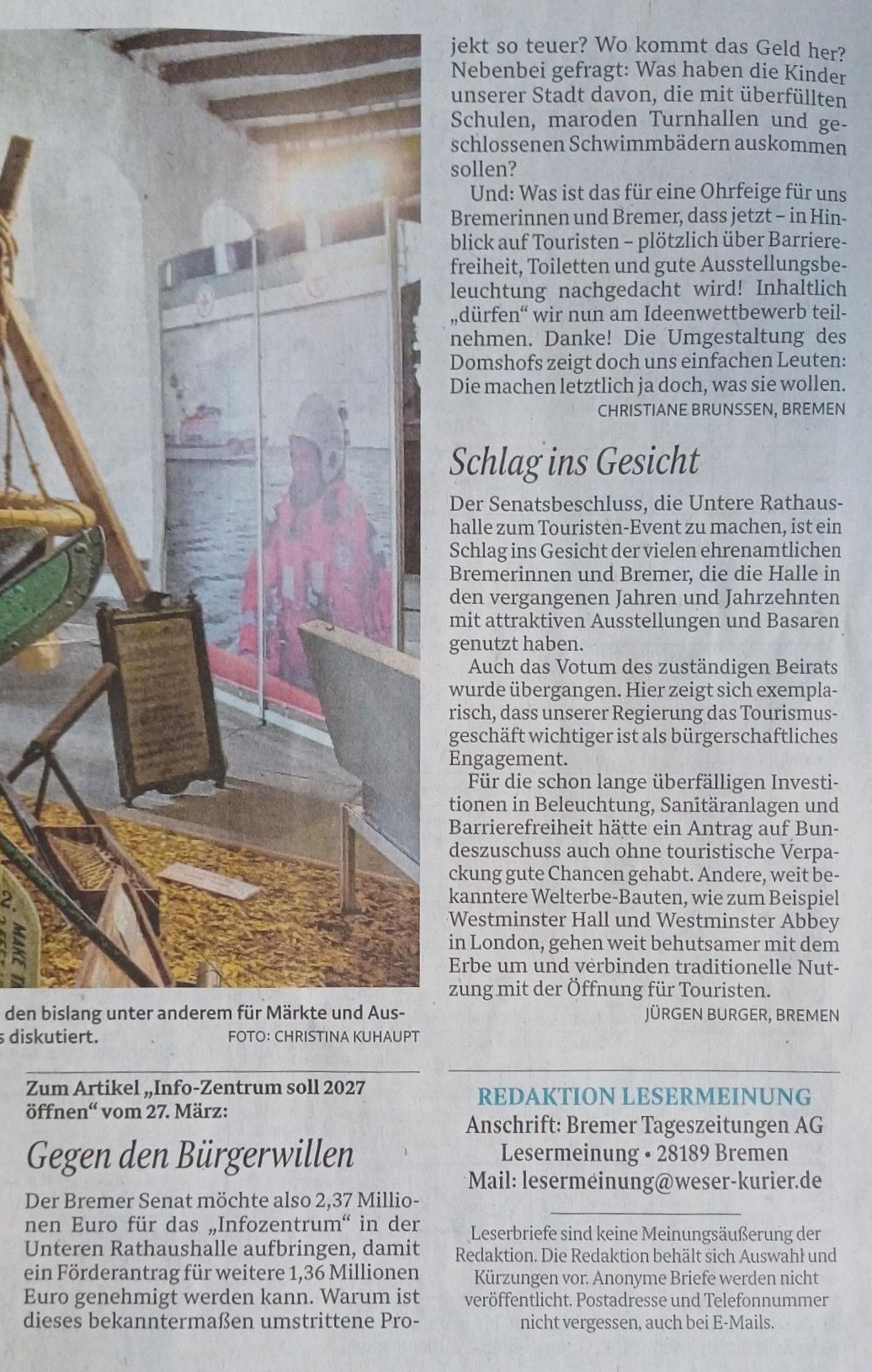 Die Bremer Senatskanzlei beabsichtigt, ein jahrhundertealtes Recht der Bremer Bürgerinnen und Bürger abzuschaffen! Die Untere Rathaushalle soll ab 2025 ausschließlich für ein fest installiertes Kulturerbe-Informationszentrum genutzt werden.