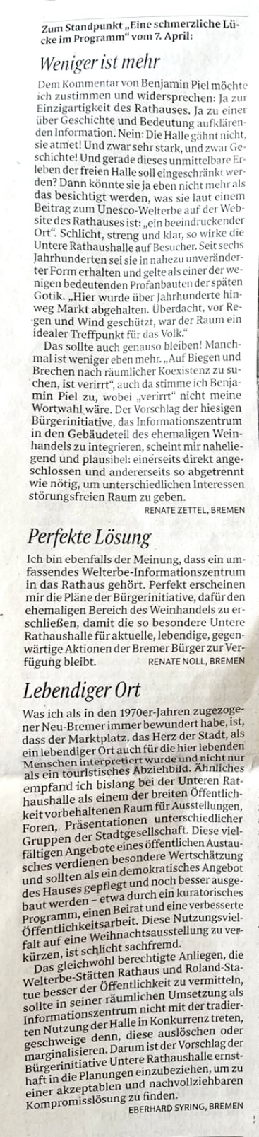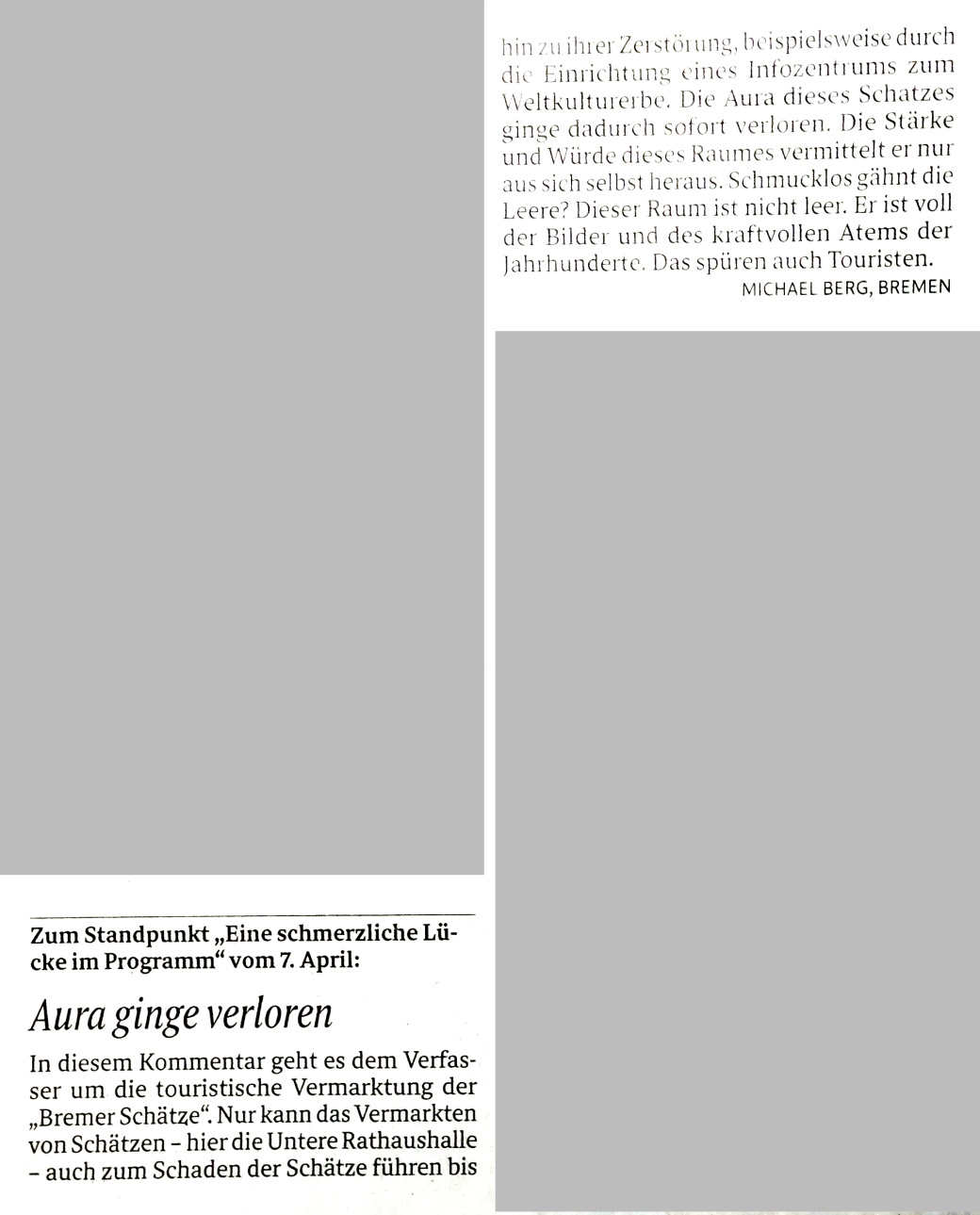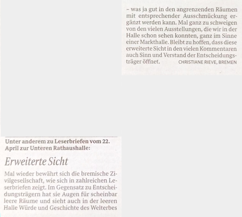 Mit freundlicher Unterstützung durch den Weser-Kurier stellen wir Ihnen hier alle Artikel und Leserbriefe zum Thema ‘Untere Rathaushalle’ als PDF-Download bereit: